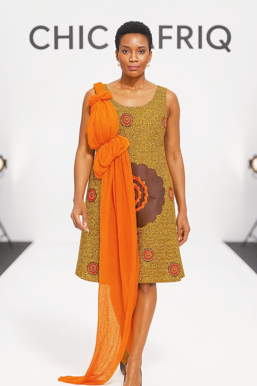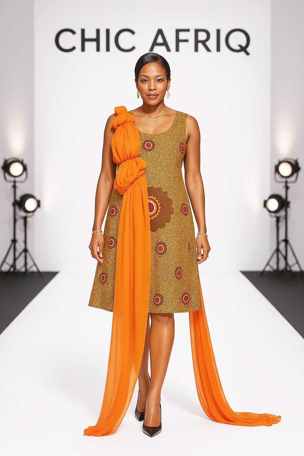 & Free ShippingThe Sunburst Grace Dress radiates elegance with a bold fusion of African heritage and modern flair. Crafted from warm-toned Ankara fabric with intricate circular motifs, this sleeveless A-line dress offers a flattering silhouette. The standout feature is the cascading burnt-orange chiffon drape, knotted dramatically at the shoulder and flowing effortlessly to the floor—adding movement, sophistication, and a regal touch to your look.