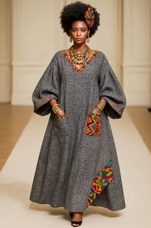 Crafted from luxurious gray 100% linen, this full-length gown features Kente fabric in the spirit of Versace β reimagined through a bold African lens. The Kente cloth ground the piece in rich cultural legacy.