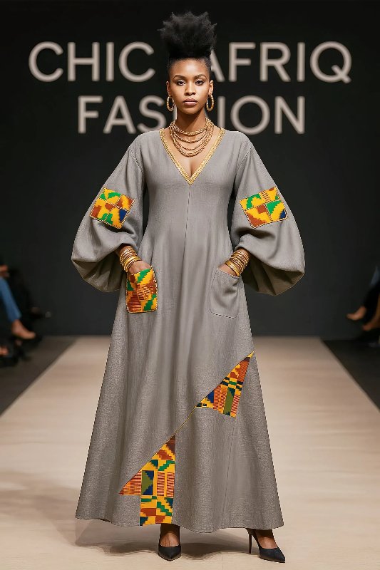 & Free ShippingTailored from 100% premium gray linen, this Afro-chic stunner fuses Italian couture inspiration with bold Ghanaian heritage. Oversized Kente patch pockets grace the sleeves and bodice, while a striking Kente slash panel sweeps across the hemline like a royal sash. The wide silhouette flows with elegance, while the outrageous sleeves bring high-fashion drama. Finished with gold stud accents and a V-neckline trimmed in Ankara, this gown is designed for women who show up to be seen.